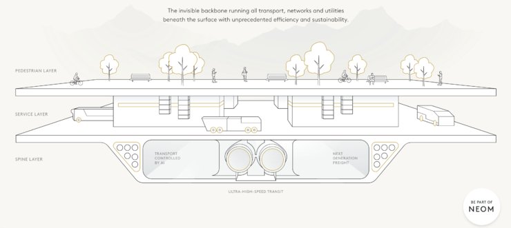 第三层,也就是最底层,这里有AI赋能的交通运输、超高速交通、下一代货运业务。超高速运输管道成为这条直线城市的骨干,它将线上的社区串联起来,人们可以在20分钟之内达到城市的任何地点。(相当于杭州到上海只要20分钟)