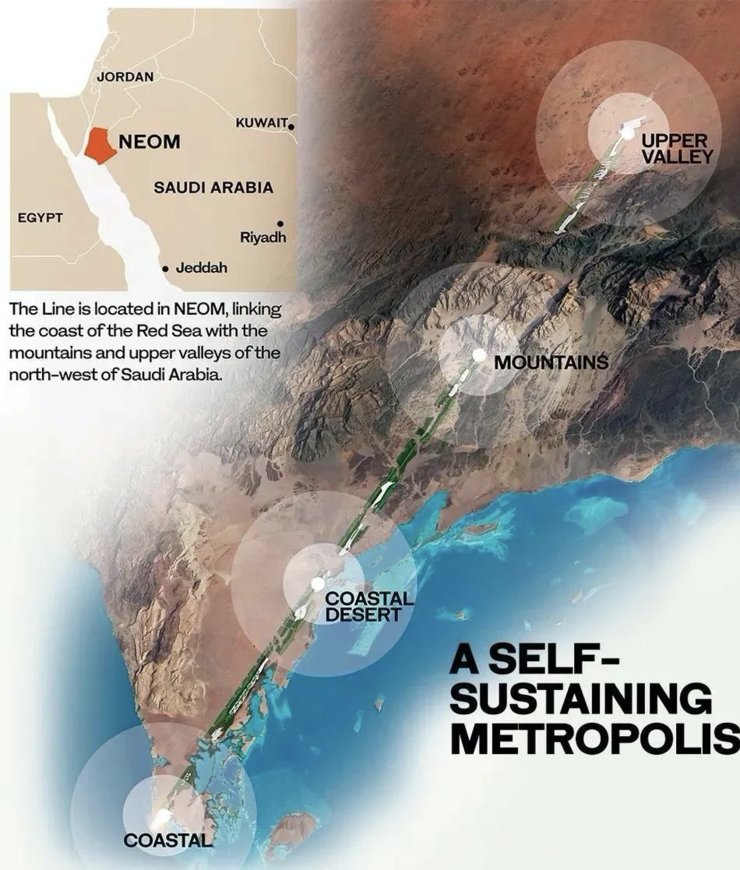 2021年1月,王储萨勒曼再次向世人宣布,沙特政府将投资1000亿至2000亿美元,在NEOM内建造一座名为「The Line」的新城。